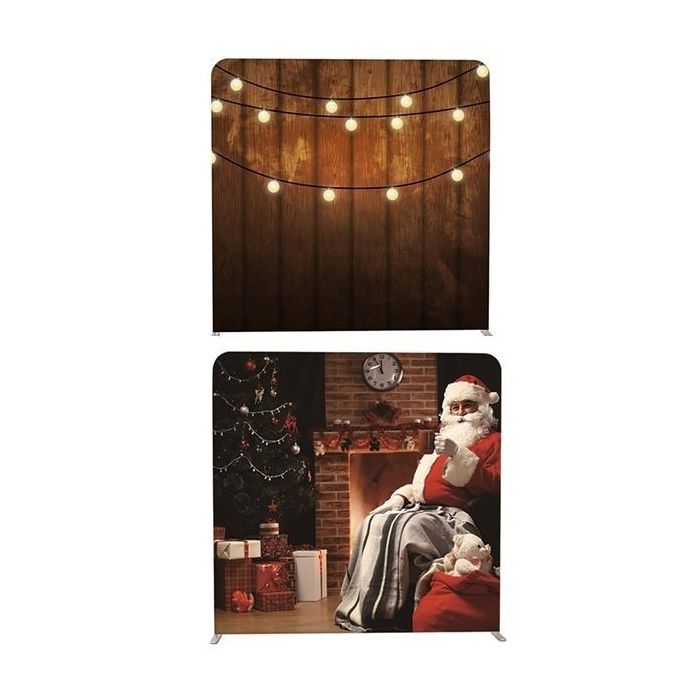 Lights on Rustic Wood & Santa Claus Scene design Backdrop with 8ft x 8ft Frame. This 8 ft Straight Tension Fabric Display Kit is very easy to assemble. It consists of a lightweight, but strong, aluminium frame, with middle support bar for extra strength, and a stunning, wrinkle-free, tension fabric, pillow case backdrop. Very easy to assemble, in less than 10 minutes for a quick and easy set up. FREE DELIVERY!