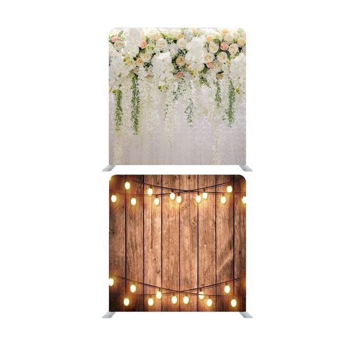 Rustic Wood with Fairy Lights and Beautiful Pastel Flowers and Foliage backdrop with 8ft x 8ft Frame. This tension fabric display kit is very easy to assemble. It consists of a lightweight, but strong, aluminium frame, with middle support bar for extra strength, and a stunning, wrinkle-free, tension fabric, pillow case backdrop. Very easy to assemble, in less than 10 minutes for a quick and easy set up
