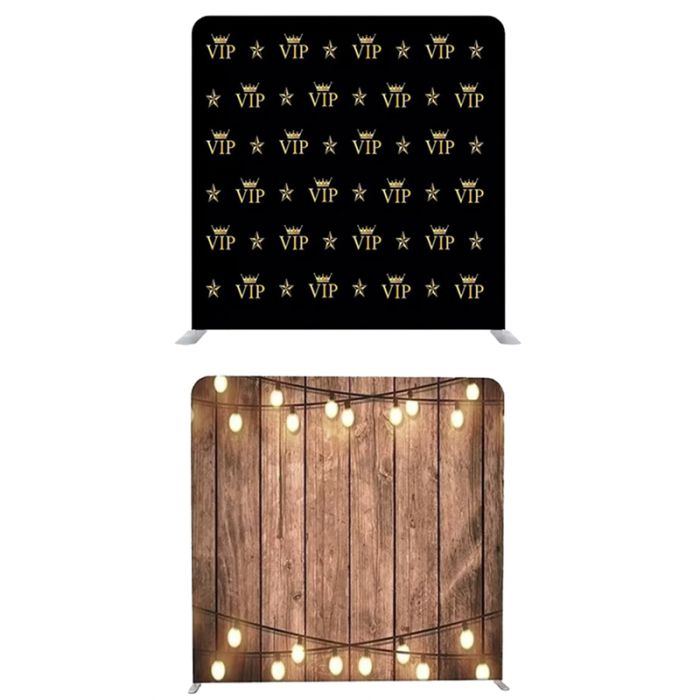 8ft*7.5ft Rustic Wood with Fairy Lights and Black and Gold VIP Backdrop, With or Without Tension Frame. This tension fabric display kit is very easy to assemble. It consists of a lightweight, but strong, aluminium frame, with middle support bar for extra strength, and a stunning, wrinkle-free, tension fabric, pillow case backdrop. Very easy to assemble, in less than 10 minutes for a quick and easy set up.