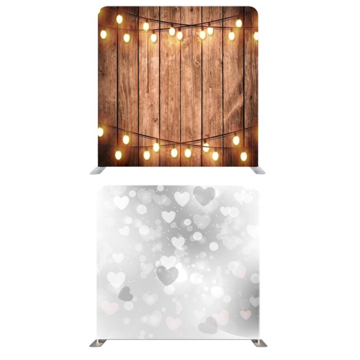 8ft*7.5ft Silver Hearts and Rustic Wood with Fairy Lights Backdrop, With or Without Tension Frame.