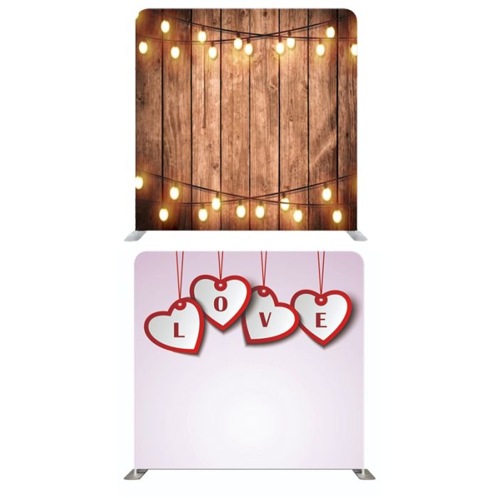 8ft*8ft Hanging Hearts of Love and Rustic Wood with Fairy Lights Backdrop, With or Without Tension Frame, with a middle support bar for extra strength, and a stunning, wrinkle-free, tension fabric, pillowcase backdrop. Very easy to assemble, in less than 10 minutes for a quick and easy set up.