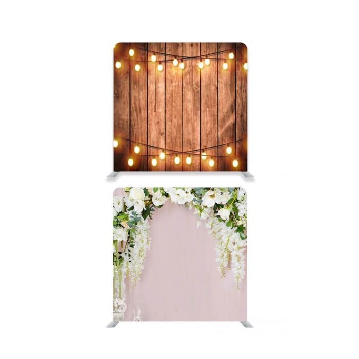 8ft*8ft Rustic Wood with Fairy Lights and Pastel Flowers on Pink Background Backdrop. This tension fabric display kit is very easy to assemble. It consists of a lightweight, but strong, aluminium frame, with a middle support bar for extra strength, and a stunning, wrinkle-free, tension fabric, pillowcase backdrop. Very easy to assemble, in less than 10 minutes for a quick and easy set up.