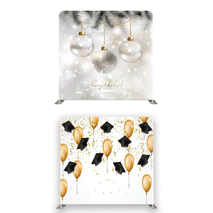 8ft*8ft Silver Xmas And Graduation Cap Balloons Backdrop, With or Without Tension Frame, with a middle support bar for extra strength, and a stunning, wrinkle-free, tension fabric, pillowcase backdrop. Very easy to assemble, in less than 10 minutes for a quick and easy set up.