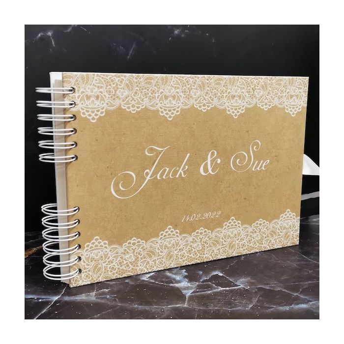 Personalised Classic Brown Design with White Lace Detail Guestbook with Page Style Options. Introducing our brand-new stunning range of guestbook designed and made exclusively by our team which you won't find anywhere else! There is a range of extremely high-quality books to choose from that are 30cm x 21cm in size and have very thick covers and pages. These books have 40 pages, meaning 80 sheets to stick photos and write on and decorate however you please!