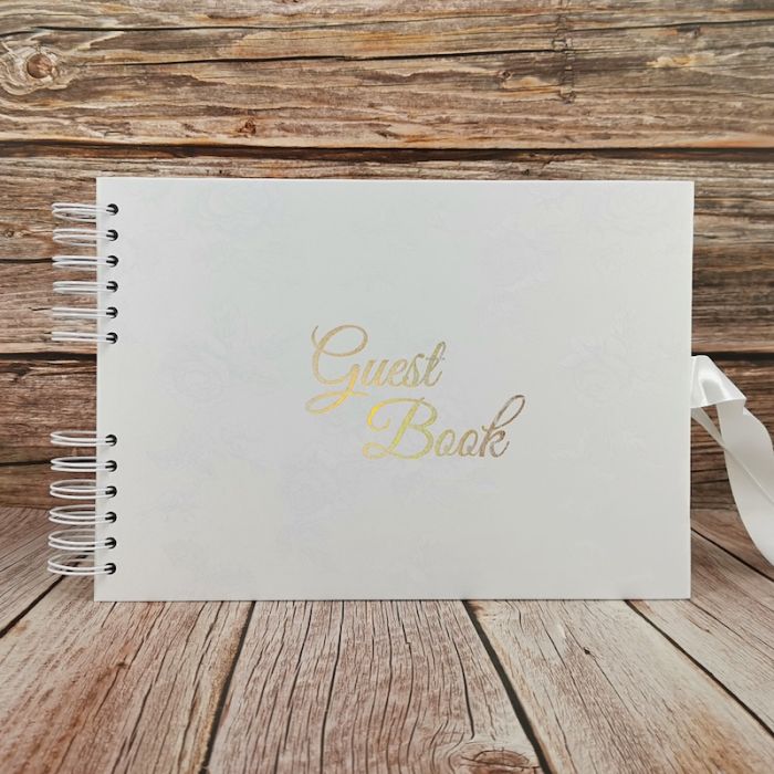 This is our fantastic looking rose patterned white cover, guestbook with golden ‘Guest Book’ message. A fantastic looking guestbook that is perfect for wedding photo booth events. This book is one of our new range and these new books are 30cm x 21cm size, extremely high-quality books, and absolute top-quality white paper pages. This page size means there’s plenty of space for photos on each page and lots of room for messages. The book can be tied with a beautiful white ribbon. Also comes with free photo corner holders. This is a lot of book for your money