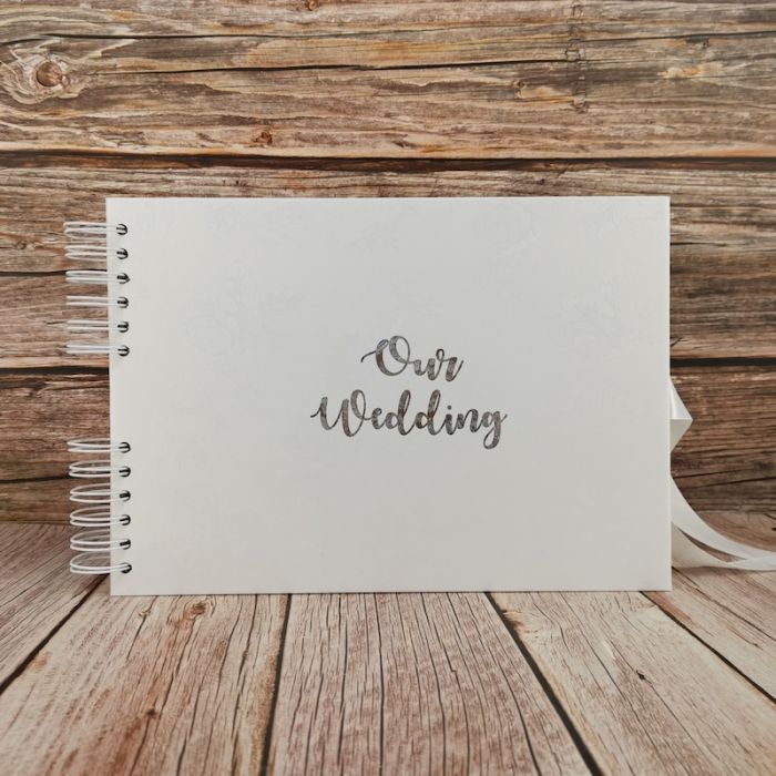 This is our fantastic looking rose patterned white cover, guestbook with silver ‘Our Wedding message. A fantastic looking guestbook that is perfect for wedding photo booth events. This book is one of our new range of slip-in page guestbooks meaning you can effortlessly place your photos in the pages and no more hassle and no more gluing. These books are 29.7cm x 22cm with white 6x4" landscape slip-in postcard photo style inside pages, extremely high-quality books and superb quality paper. This page size means there’s plenty of space for photos each page and lots of room for messages. Designed and made exclusively by us and is a book you won't find anywhere else. This is a lot of book for your money.