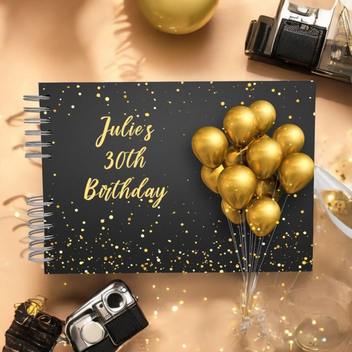 The Black & Gold Balloon Guest Book can be personalised with names and dates of your choice.