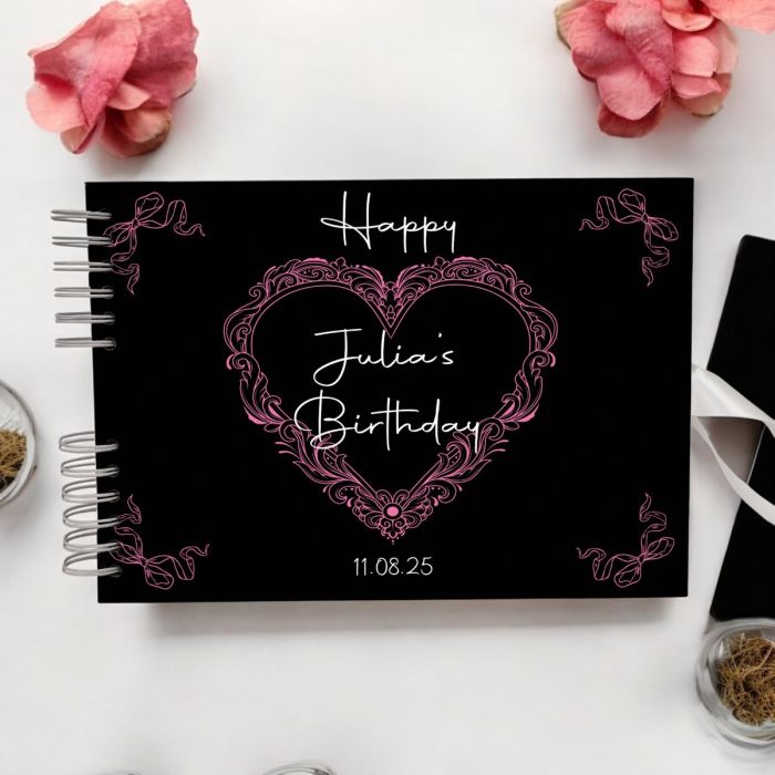 The Black & Pink Heart Guest Book can be personalised with names and dates of your choice.