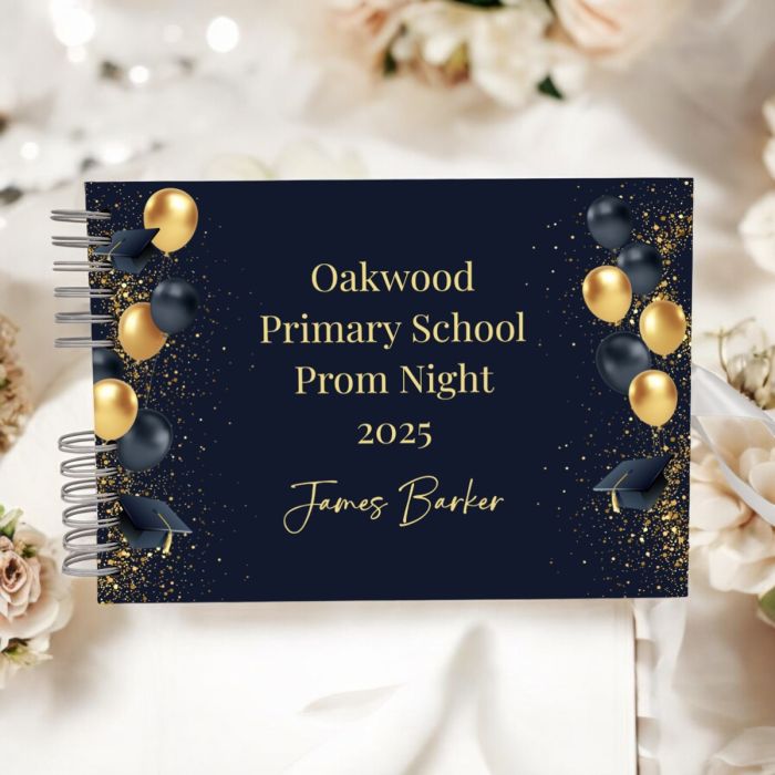 The Chic Deep Blue & Gold Graduation Guest Book can be personalised with names and dates of your choice.