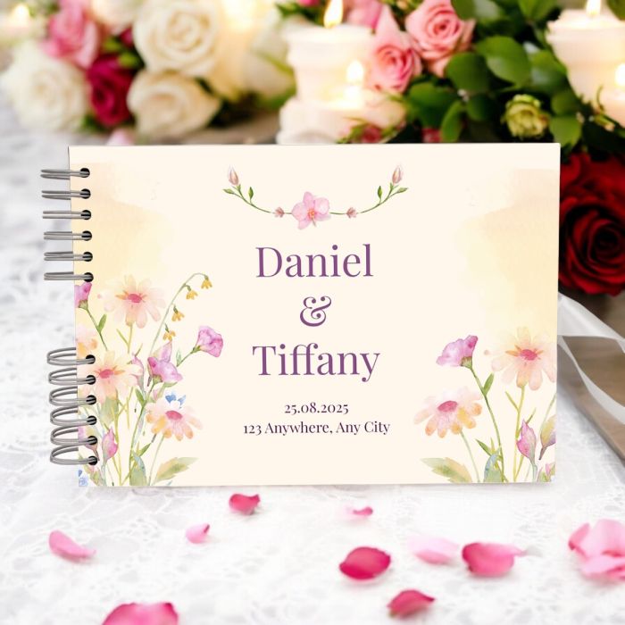 The Cream Purple Watercolour Flower Wedding Guest Book can be personalised with names and dates of your choice.