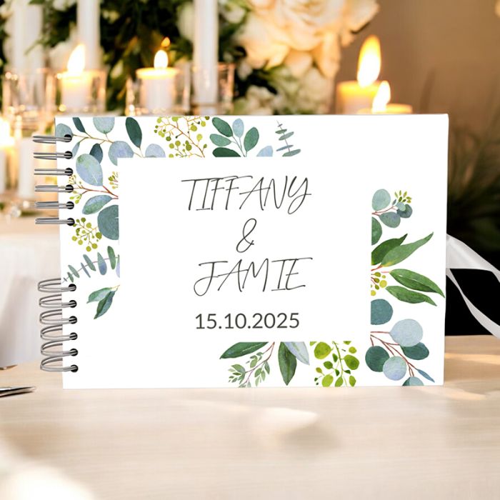 The Green Boho Eucalyptus Foliage Wedding Guest Book can be personalised with names and dates of your choice.