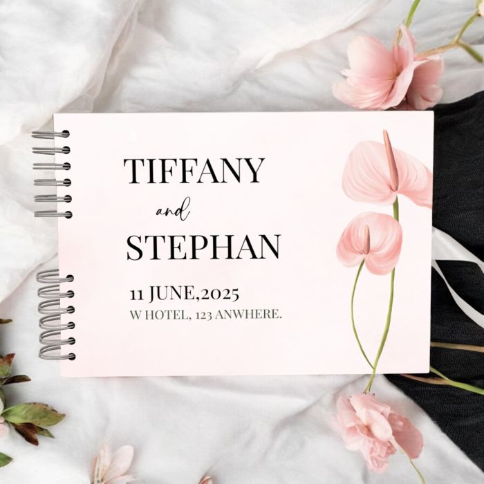 The Pastel Pink Calla Lily Delicate Floral Wedding Guest Book can be personalised with names and dates of your choice.