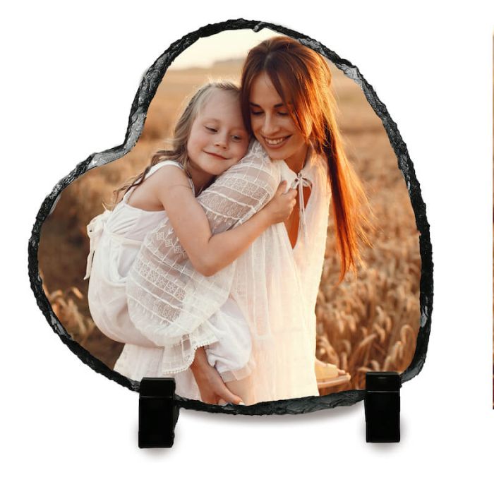 Our pure stone slate photo prints are a truly distinctive and amazing way to display and keep your most treasured photos and memories. The natural beauty of the authentic rough-cut slate is a picture-perfect setting for your cherished photos and have a stylish look that will look great in any space in your house or office. The contrasting rough edges and the perfect flat surface not only mean every single photo slate is unique and one of a kind, but they are displayed in a genuinely unique and special way. The photos are printed onto the slate using the very latest state of the art, high-definition technology. Provide us with a good quality image to use for printing and you’ll be astonished at the stunning, powerful colours and amazing detail. Choose a personalised heart photo slate to make the perfect gift to any friend, family member or loved one