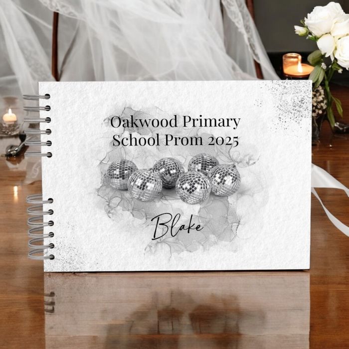The Silver Glitter Ornaments Prom Guest Book can be personalised with names and dates of your choice.