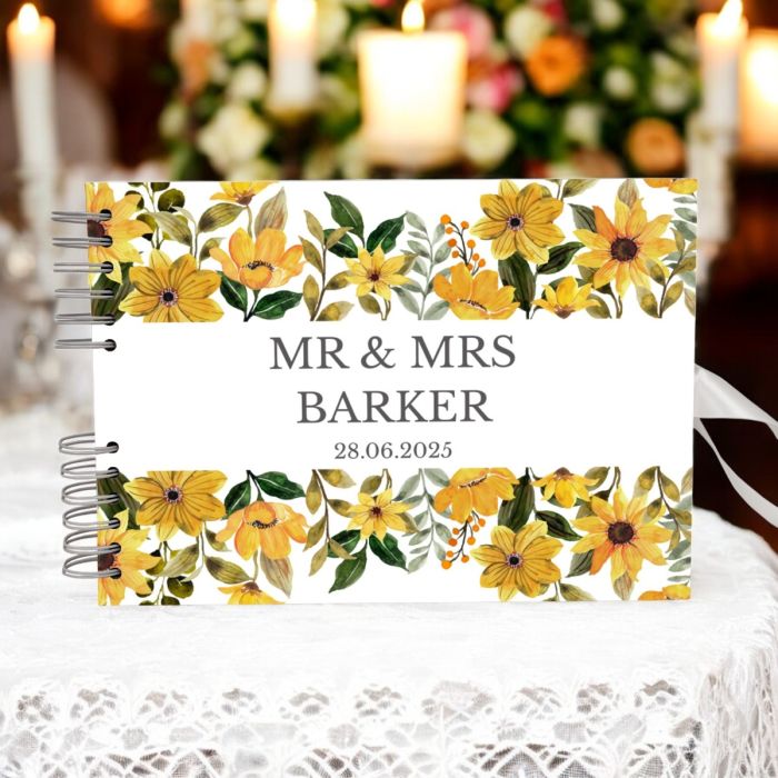 The Sunflower Watercolor Wedding Guest Book can be personalised with names and dates of your choice.