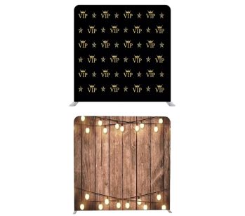 8ft*8ft Rustic Wood with Fairy Lights and Black and Gold VIP Backdrop, With or Without Tension Frame